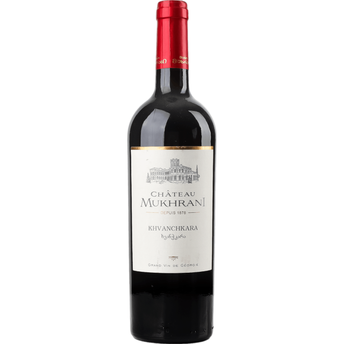 Chateau Mukhrani Khvanchkara is a semi-sweet wine produced from a blend of Aleksandrouli and Mujuretuli grapes, endemic Georgian varieties.